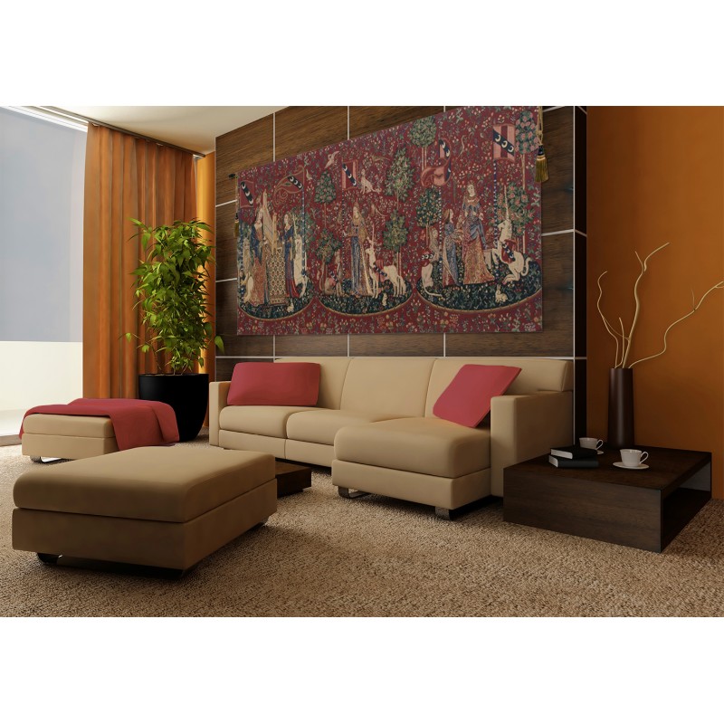 Large and bold print tapestry goes well in modern homes that are theme based. Two large woven tapestry pillows along with several contrasting small sized throw pillows creates an accent design that never goes wrong.